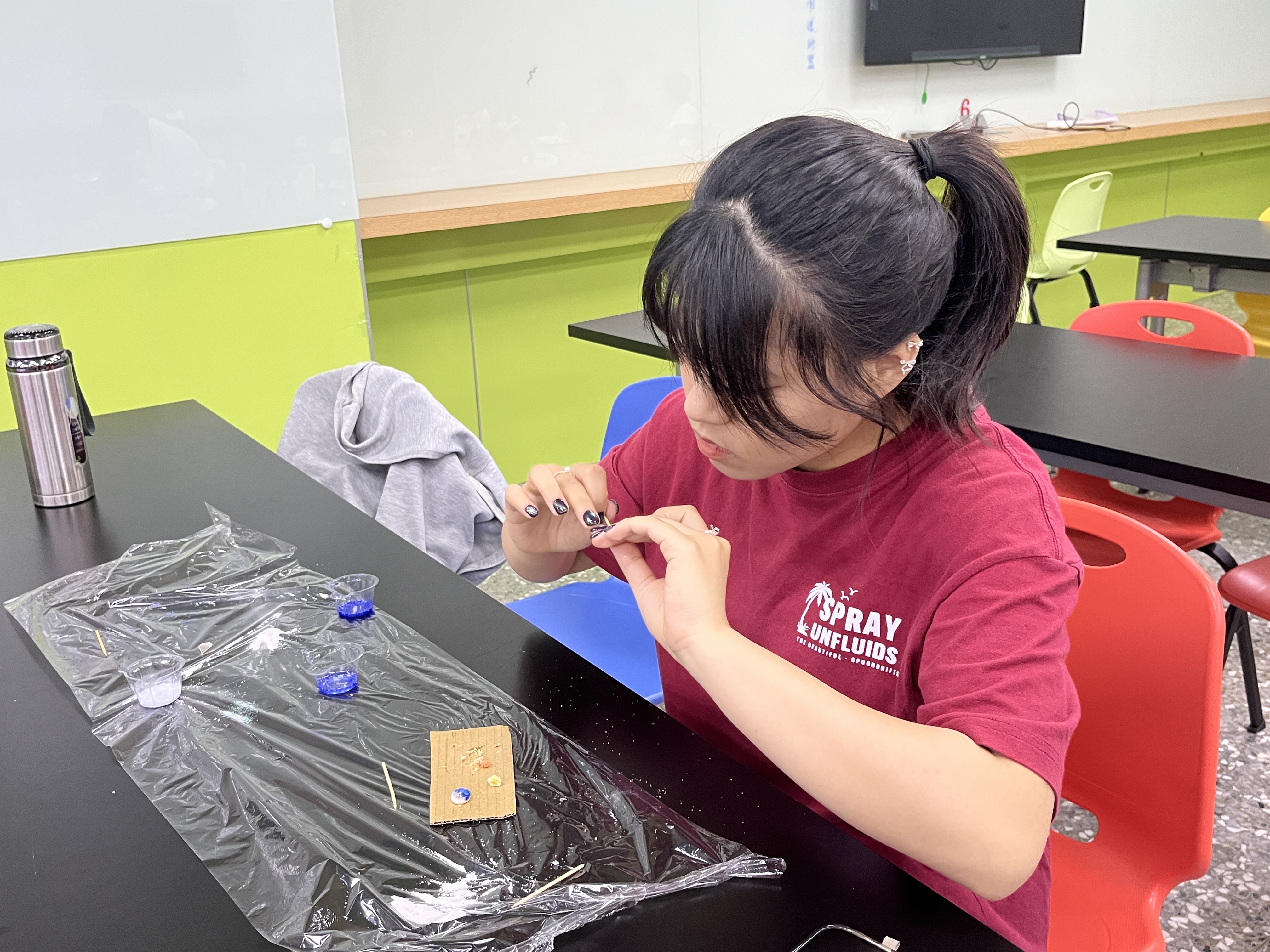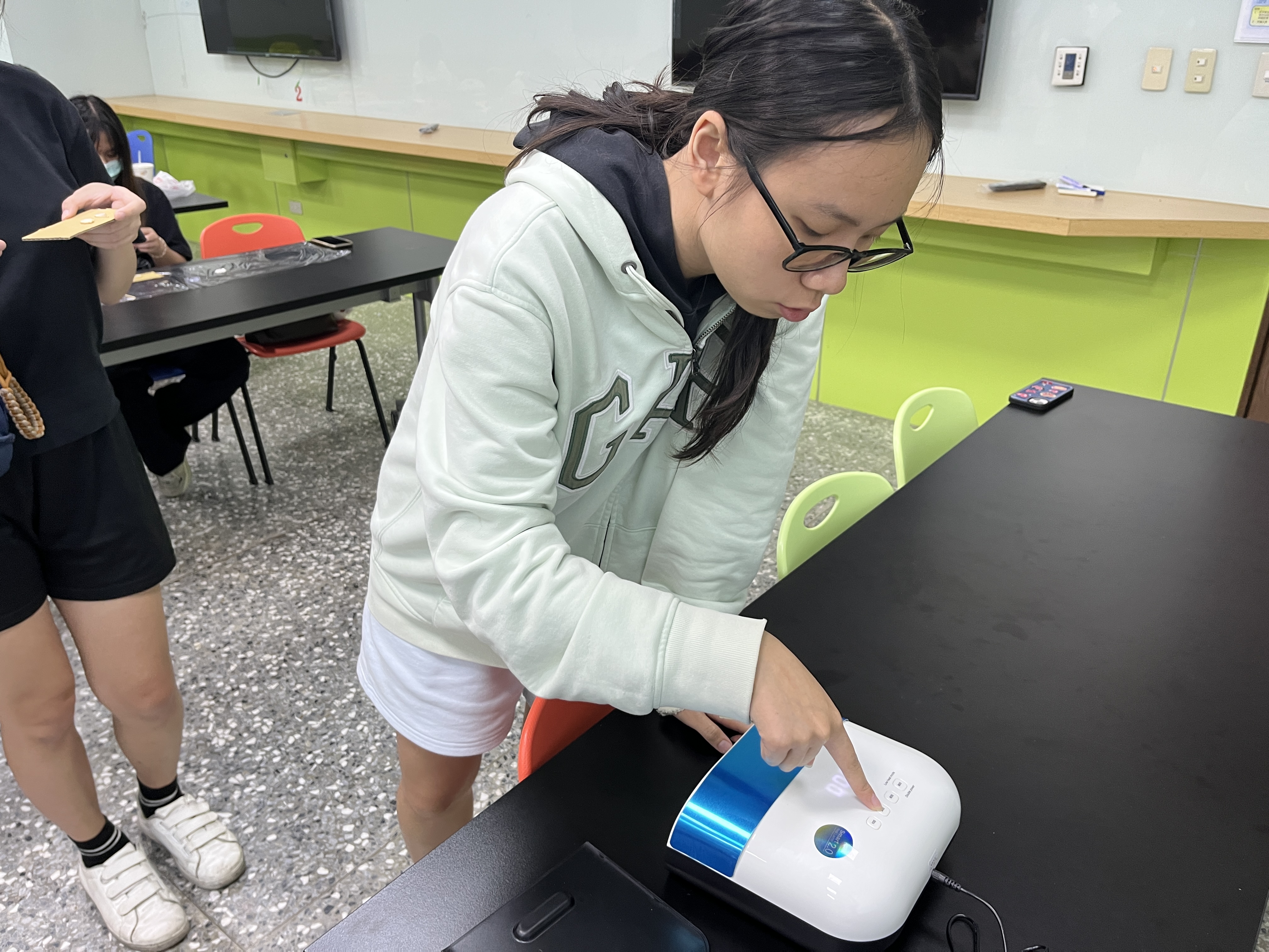 再來,進入技巧說明環節,講師詳細教授滴膠的調配比例與色彩調和原則,並示範如何運用「吹浪」技法推動白色滴膠營造生動的海洋波紋,透過循序漸進的引導讓學生將理論轉化為實際行動,在反覆調色、鋪設底膠與細心挑除氣泡的過程中培養操作耐心,逐步建立對滴膠特性的掌握度,學會在通透的膠體中精準控制色彩的流動方向。 當建立起對空間構圖的敏銳覺察後,學生們便跟隨自身的美感直覺進行創作,專注地挑選星砂、海貝等裝飾配件,在微小框架內進行精細的立體佈局,不僅展現了高度的美學敏銳度,最終更成功將抽象的海洋意象化為一件件獨特的「海邊風景鑰匙圈」。 這些微型藝術作品後續將全數投入公益義賣,讓學生透過實際參與深刻體會到,即使身為學生資源有限,依然能將手作的溫度轉化為具體的助人行動,以自身力量為弱勢族群帶來實質的支持,真正落實社會關懷的價值。 護理系的陳同學:這次活動讓我體會到同伴合作的重要性。在施作期間,大家需要互相配合、輪流共用照燈與滴膠工具,培養了彼此的默契,也因為有了協助與交流,讓整體的製作過程變得更加順暢且有效率,是很棒的團隊互動體驗。 心理系的劉同學:課程中讓我更加了解如何運用色彩搭配來呈現心目中的畫面,還有滴膠從調色、等待消泡到固化,每一個步驟都需要極大的耐心去對待。我覺得這個過程不僅是在完成一件手作,更像是一場靜心修練,讓自己學會放慢腳步,細膩地去雕琢每一個作品細節。 資工系的楊同學:手作的過程真的需要滿滿的耐心。雖然實作中難免會因為某個步驟的小失誤,或是配件擺放得不夠完美而感到懊惱,但我想這正是手作的真實與迷人之處,因為在專屬的作品從手中誕生的那一刻,內心的成就感和感動是非常充足的。 社工系的陳同學:這次完整學習到滴膠工藝的製作技巧與原理,且在專注於調色與鋪設配件的當下,彷彿建立了一個專屬的寧靜空間。看著清澈的膠體慢慢流動、凝固,平時的壓力與煩躁感也隨之消散,整個製作過程對身心都是一種極大的放鬆與療癒。 物治系的林同學:透過講師仔細的講解,不僅從零開始掌握了滴膠的正確使用方法,還學到了許多關於配件造型與立體佈局的實用小技巧,了解到原來只要透過不同的層次堆疊與擺放邏輯,就能讓原本平面的裝飾物,在小小的鑰匙圈裡展現出豐富的視覺效果,收穫非常多! 本次活動共有27位學生前來參與,大家不僅在課程尾聲親手製作出專屬的海邊風景滴膠作品,更在沉浸於手作的過程中收穫了靜心與耐心,同時掌握了滴膠的物理特性與微型造景的技巧,成功把美學知識轉化為實用的藝術表達能力。期盼未來同學們都能將這份對生活美感的覺察落實於日常,讓手作的純粹與療癒力量,成為穩定身心與陪伴生活的長期支持。 |