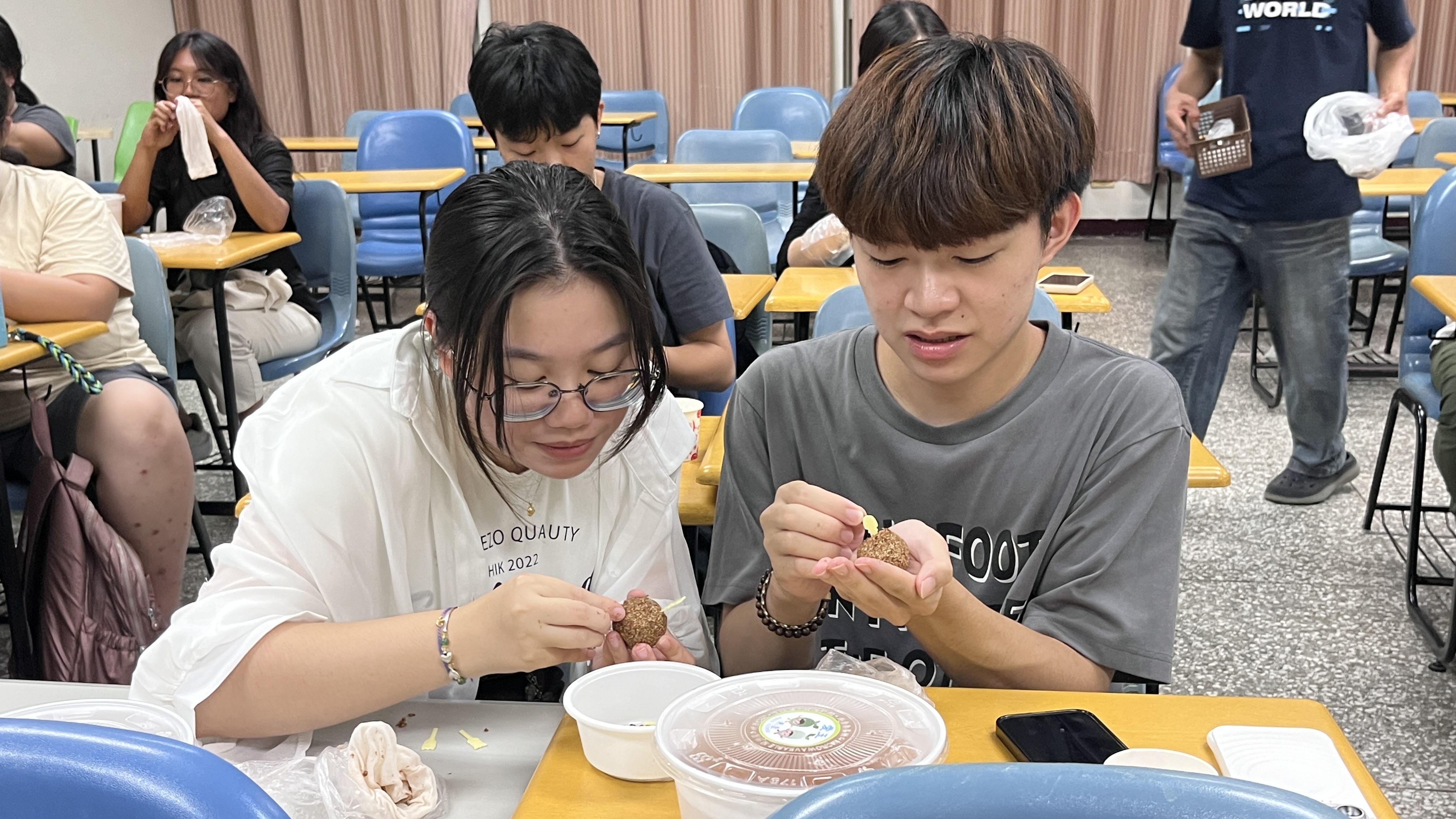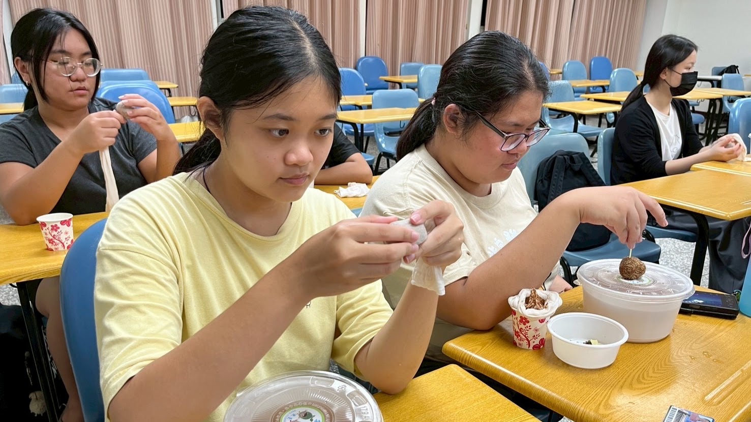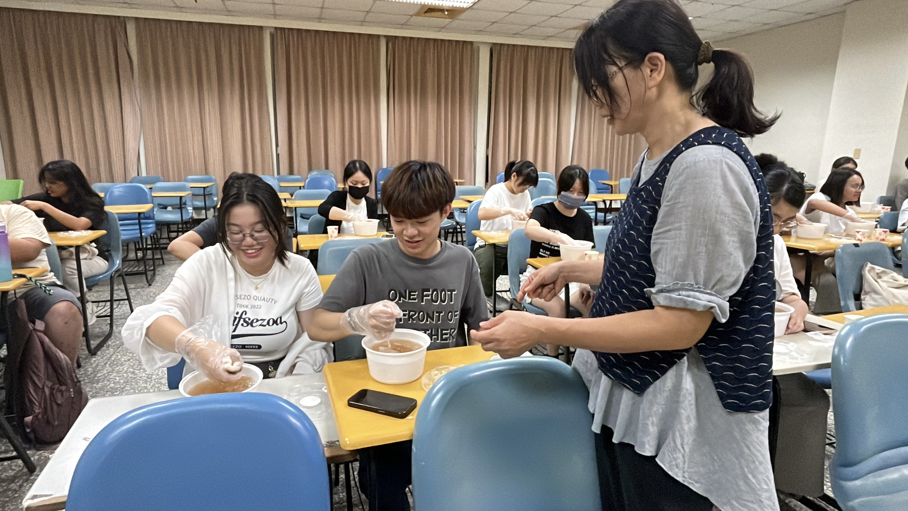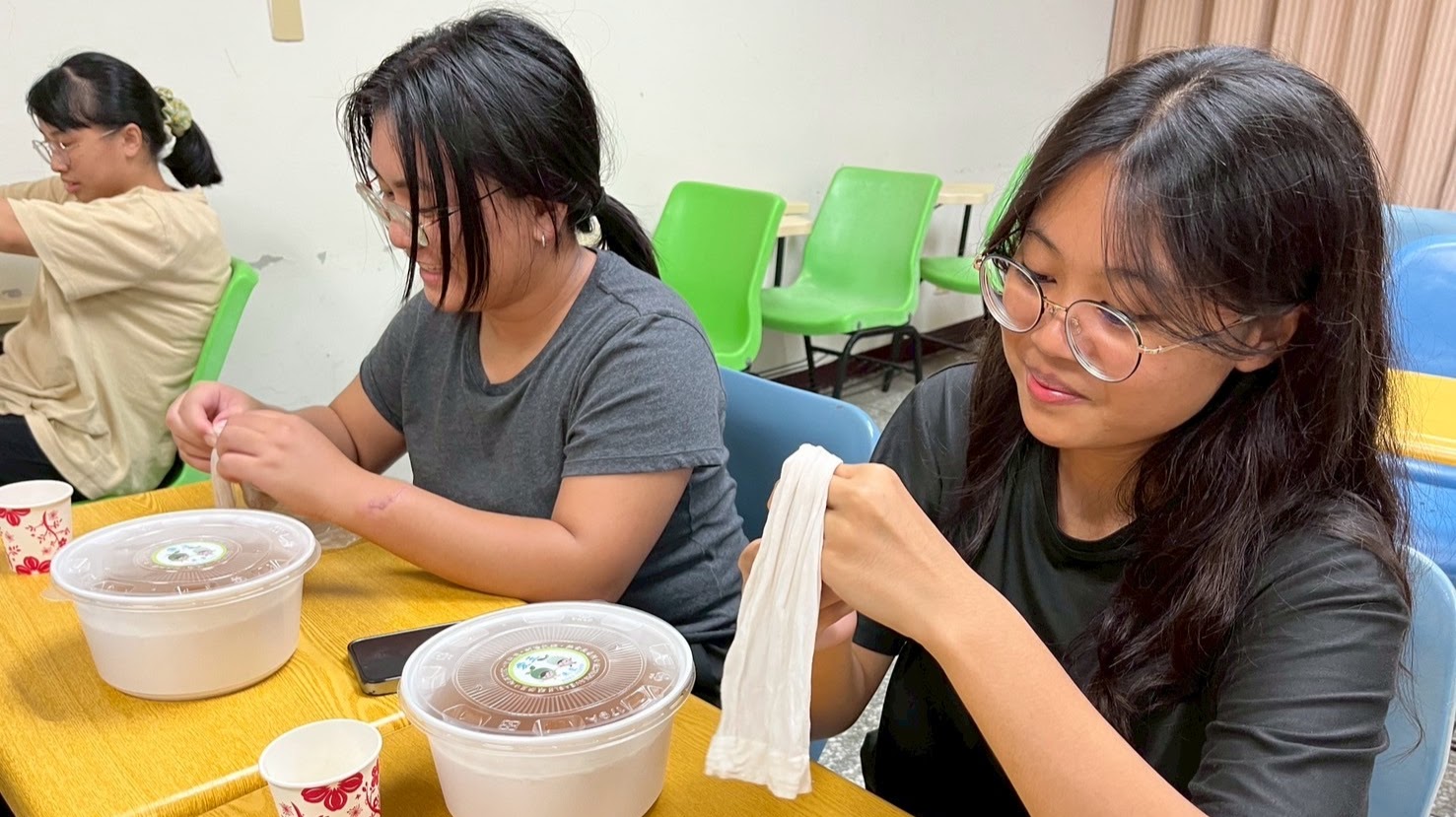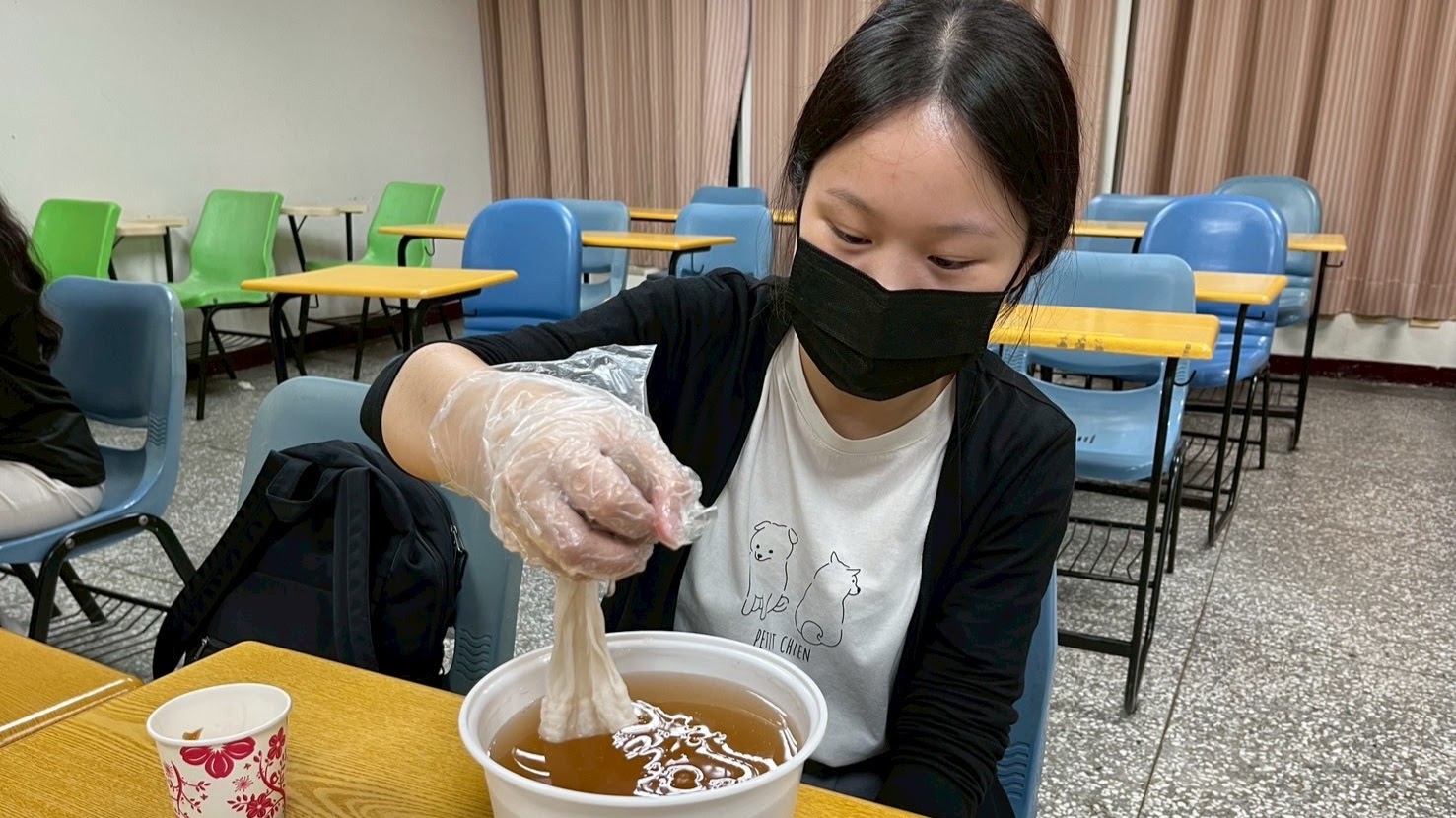 在實作環節中,學生們開始體驗搓揉愛玉籽,鍛鍊揉搓的力度與時間的掌握,並透過觀察果膠逐漸釋出的變化來判斷愛玉的完成度。等待愛玉凝固的同時,學生利用愛玉籽,發揮設計創意,製作成獨一無二的可愛娃娃,藉此,不僅更深入理解愛玉籽的黏著特性,也能展現自己的搭配與美感,同時培養專注力、耐心與觀察力,體驗從原料到完成品的樂趣與成就感。 幼教系王同學分享:「透過課程學習到原來愛玉是台灣特有的植物,也了解製作愛玉所需的條件,更驚喜地發現愛玉籽還能重複利用,甚至可以變成可愛的玩偶,既環保又有創意。」 心理系華同學表示:「在搓愛玉的過程中,不僅認識了愛玉形成的原理,也學會分辨真假愛玉,動手操作的體驗讓我覺得特別有趣。」 醫技系林同學說道:「這次活動讓我更深入認識愛玉,不僅對它的製作方法、原理及成分有了初步了解,也知道愛玉除了能食用外,還能將種子製作成文創小物,應用十分多元。」 職治系高同學表示:「第一次親手體驗搓愛玉覺得很新鮮,雖然到後面手有點痠,但過程中不只體驗了製作,還學到愛玉的起源,讓我覺得很厲害,因為沒想到它的發現故事這麼直接而有趣。」 生醫系賴同學分享:「這堂課讓我了解了愛玉的由來與製作過程,也知道『愛玉』的名字其實是發現者以女兒之名命名的,讓我覺得特別有意思。」 本場活動共有25位學生參與,從品嚐愛玉、動手搓揉,到創作愛玉籽娃娃,透過實作與觀察,學生不僅掌握愛玉的製作原理與鑑別方法,更深入了解台灣特有植物的生態知識與文化背景,然後在創意設計愛玉籽娃娃的過程中,練習專注力與細節觀察,展現美感與巧思,也學會如何將自然素材轉化為具創意與環保價值的作品。最後,學生帶走的不僅是一份清涼甜品與別具巧思的作品,更是一段將自然知識、文化故事與生活樂趣相互連結的難忘經驗。 |