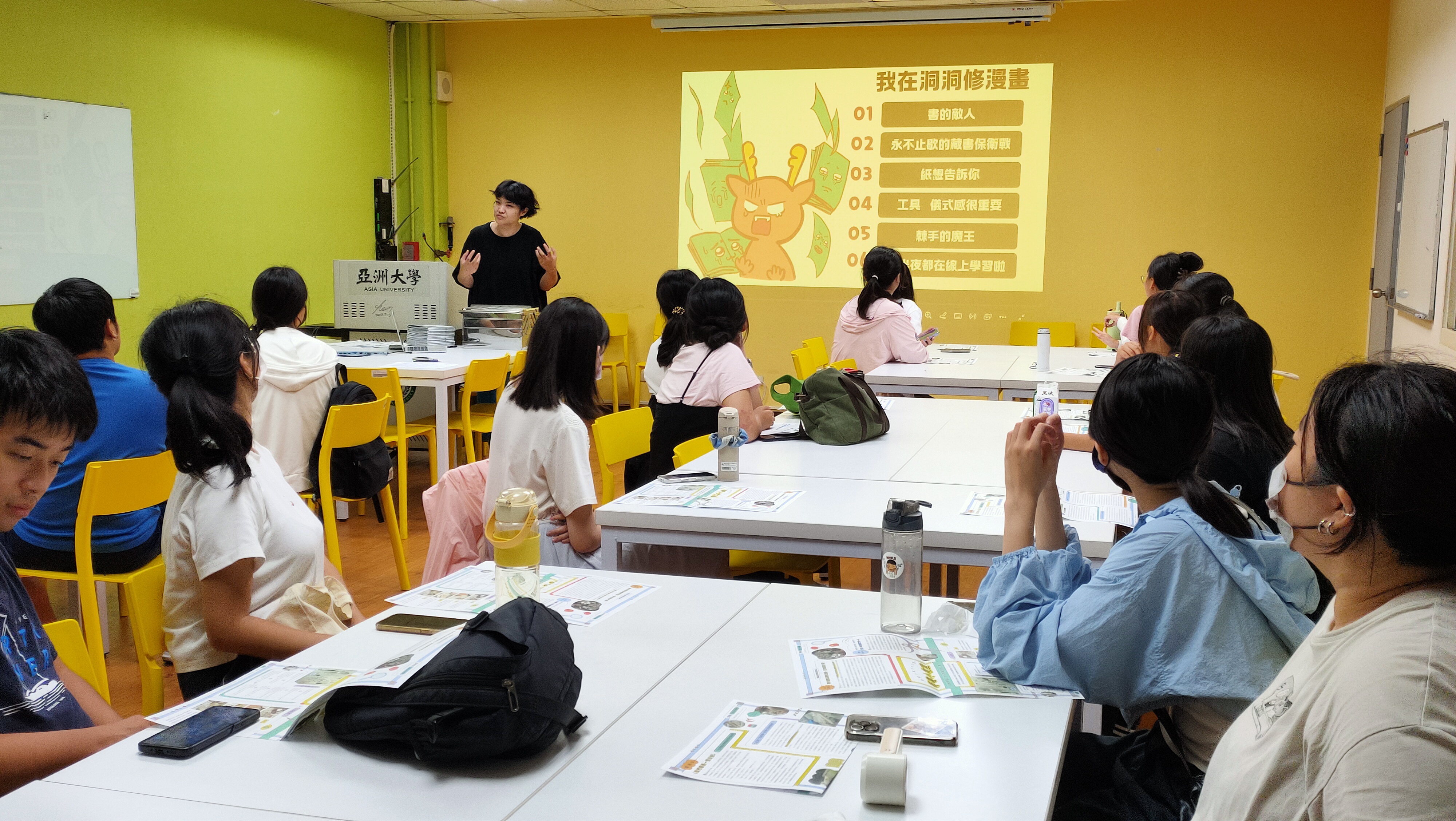 講師:解永華 活動簡介:學習書籍修復的原理與常見問題處理流程,建立保存與維護知識資產的基本能力;透過實作理解紙本媒材的特性與修復倫理,發展細緻操作與問題解決技巧。 書籍修復是一門融合知識與工藝的藝術,不僅能讓老書重獲新生,更讓人重新體會閱讀與收藏的價值。亞洲大學感恩學苑於114年10月13日晚間六點半時於HB88舉辦了「實體書修復工作坊」活動,誠邀解永華講師傳授書本相關知識與修復技巧。 活動開始,講師先從真實的修書案例切入,分享書店中常見的「傷書」現象,如客人抽菸、飲食時弄髒書頁等,讓學生了解書籍受損的多種原因,而在修復過程中最容易犯的錯誤有過度使用清潔劑、光線直照導致書頁退色,甚至以挖書的方式去除髒污層等錯誤示範。接著,介紹了修書所需的各式工具與可替代用具,並結合自身經驗談到修書過程中曾發生的小意外,提醒學生修復時應謹慎操作。