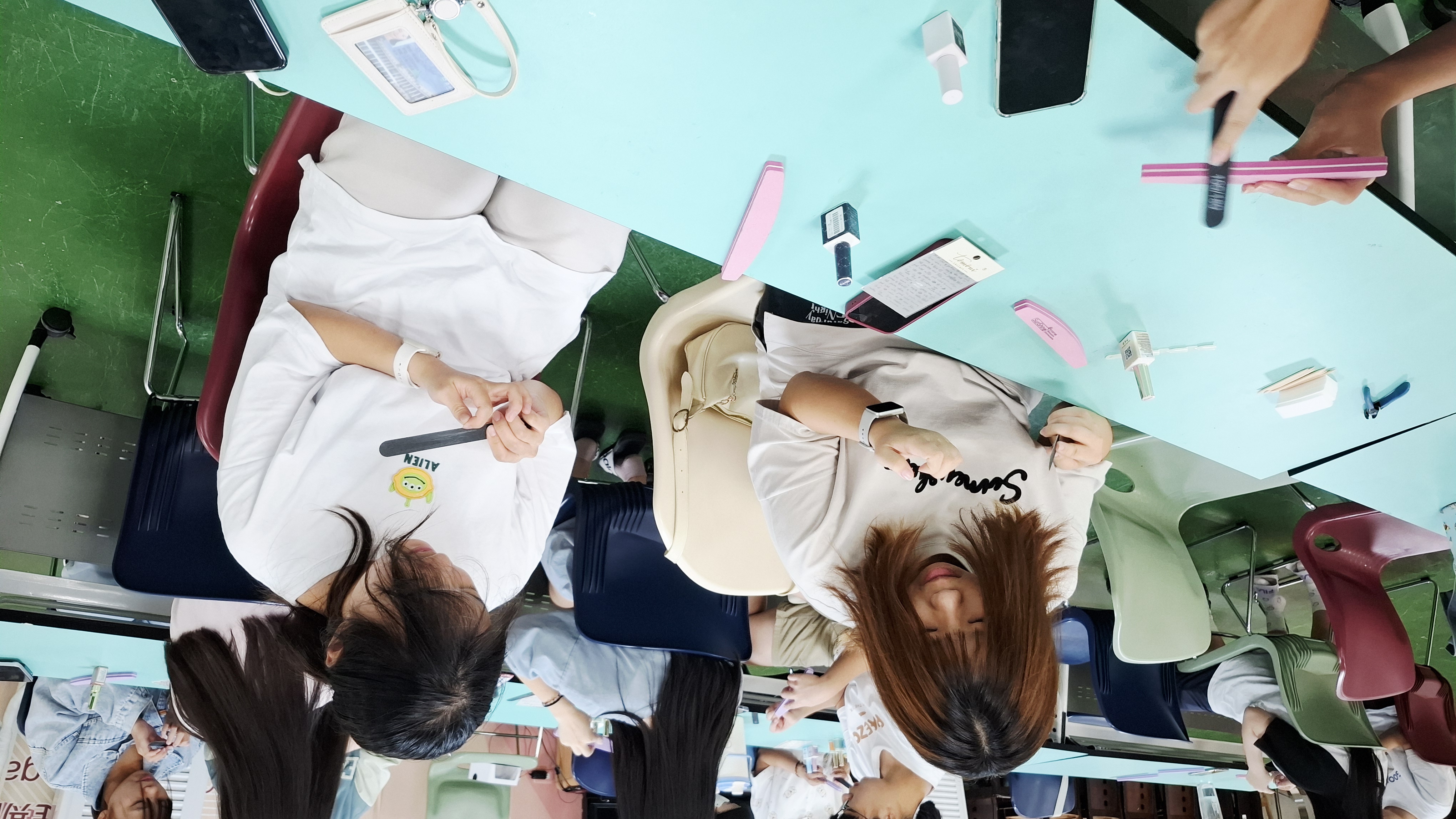 進入實作時,學生開始處理自己的指甲,先拿起搓刀修磨形狀,再用死皮推輕壓指緣,接著,拿海綿挫拋磨指甲表面,再擦上清潔液與平衡液,最後疊加色膠上色挑選、亮片和貼紙並照光完成美甲創作。透過親手修整指甲,讓同學熟練指甲修護、底膠塗布、彩繪與造型設計技巧也建立個人風格審美與對外在儀容的整體敏感度。 健管系林同學表示:「一直對美甲很有興趣 但是不知道從何下手 藉由這堂課程 讓我對美甲製作有初步的了解」 會資系王同學說:「透過這次課程,我學會完整的美甲流程,從修形到上色都好有成就感。」 社工系林同學分享:「以前從沒想過上色前還要上平衡液和底膠,學到這些細節覺得很實用!」 另外,也有學生提到,這次課程讓他們更加了解專業美甲師的用心。 職治系戴同學說:「以前都是讓別人幫我做指甲,這次自己做才知道每一步都不容易。」 視光系林同學分享:「學到做美甲的步驟及技巧,認識不同指甲的形狀和修剪方式,若之後自己在家也可以動手做做看」 本次美甲實作課程共有29位學生參與,從指甲修形、角質清理,到底膠塗布、上色與造型裝飾的完整操作過程,學生們不僅掌握了美甲的基本流程,更專注於細節,培養了對個人風格、色彩搭配與造型精準度的敏銳度,講師也鼓勵學生將這份專注與細緻延伸到日常生活,讓照顧自己不僅停留於外在,成為一種生活美學與品味的展現,也讓想從事美業的同學具備進階美甲學習或創業基礎。 |