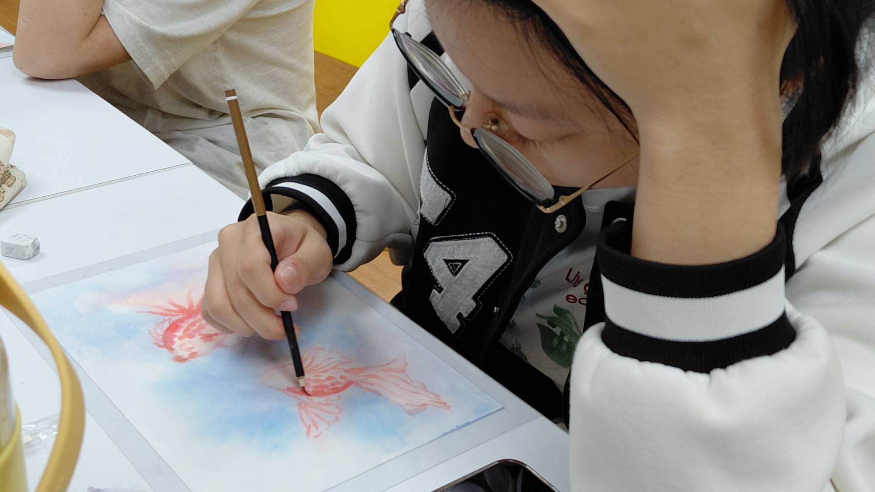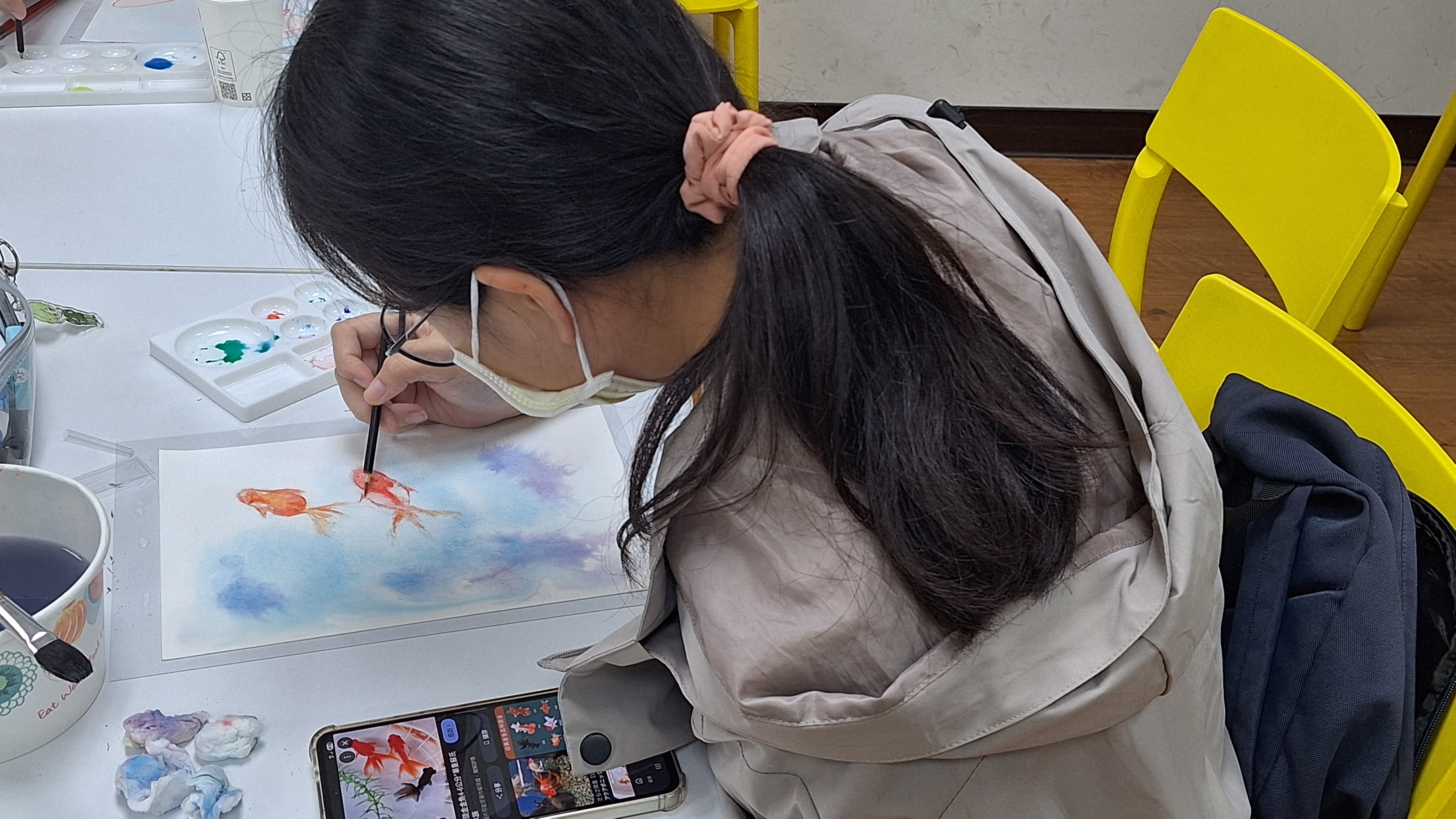 實作階段,學生們依照步驟描繪金魚輪廓,逐步進行上色與暈染,在反覆疊加色彩的過程中,體驗水與顏料交融所帶來的流動感與層次變化,創作過程中,學生們也透過反覆嘗試與調整,理解色彩堆疊與層次表現在畫面的重要性,並學會在深淺中取得平衡,使作品呈現出自然且通透的視覺效果。