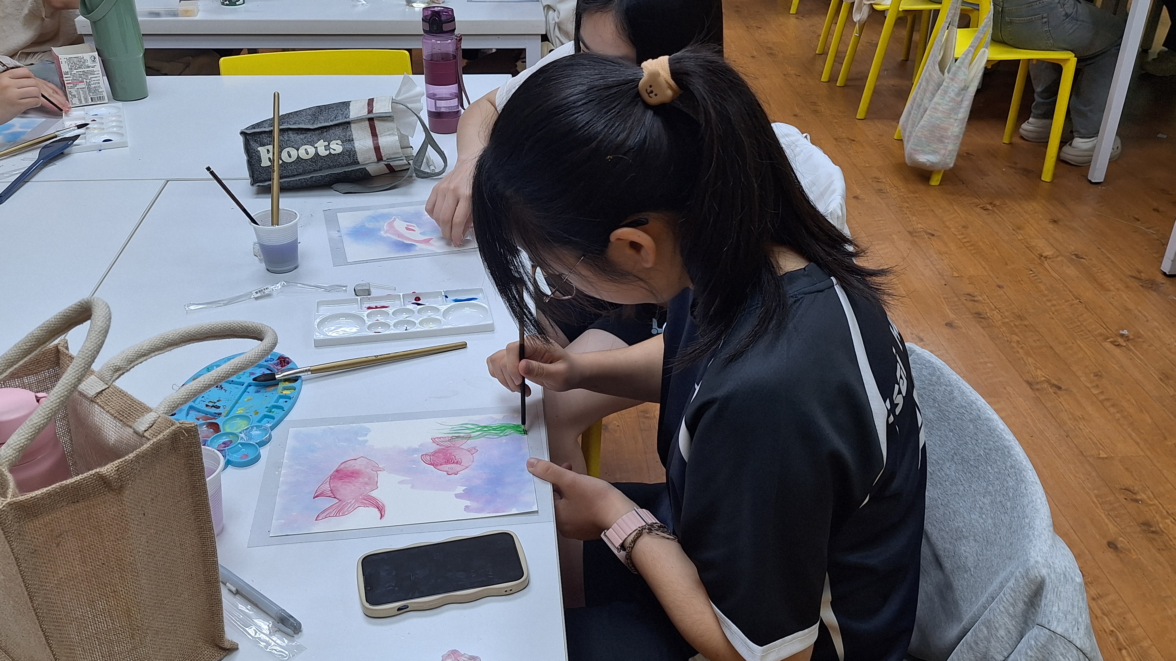 活動開始時,講師進行基礎材料介紹與工具說明,讓學生了解透明水彩的特性與使用方式,並透過示範引導學生熟悉水分控制與顏料調配的基本技巧,在講師的指導下,學生們逐步掌握透明水彩的操作技巧,能夠運用水分控制與顏色暈染表現金魚的流動姿態與水中光影變化。