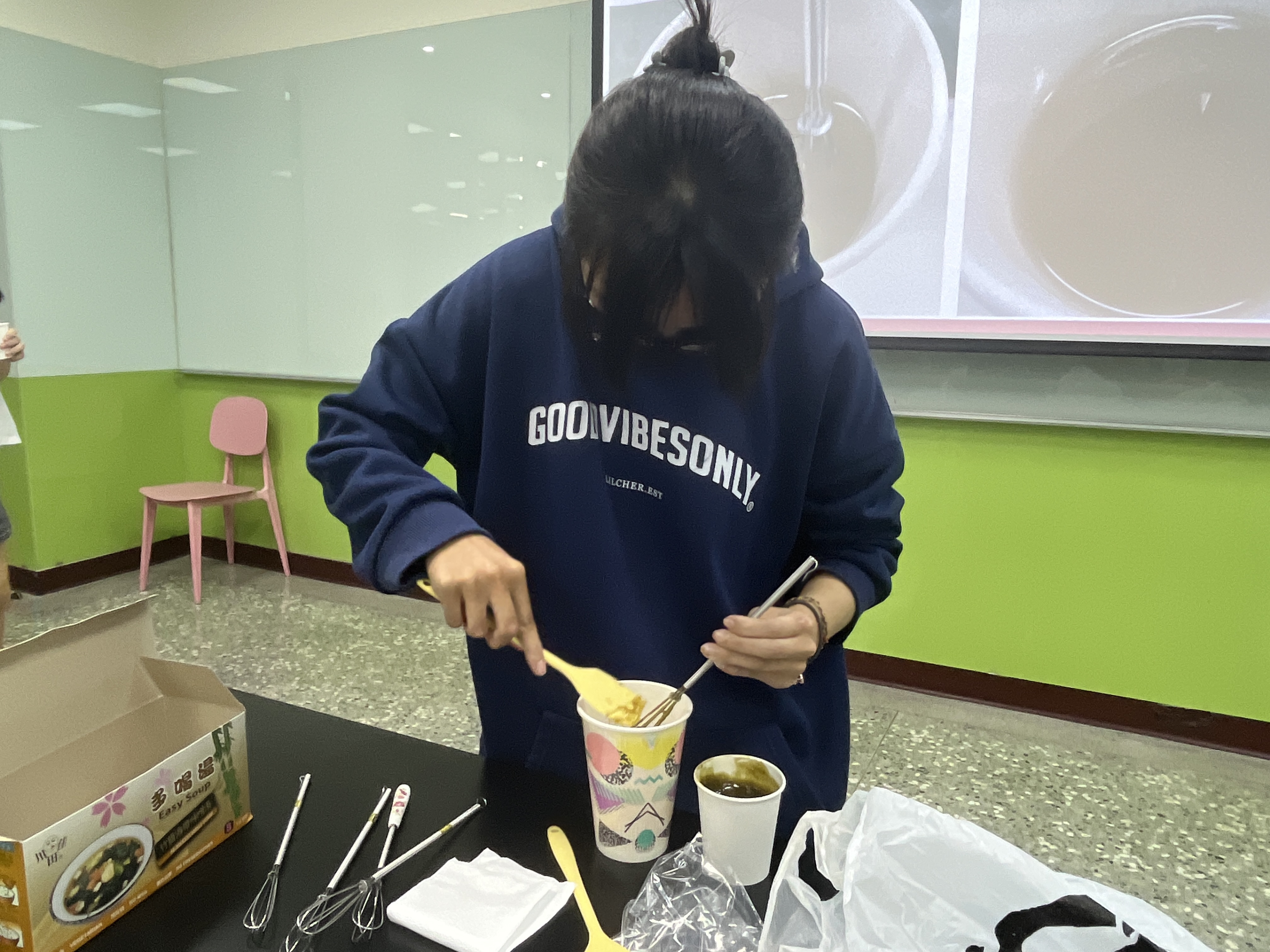 進入實作環節,學生將理論知識轉化為具體行動,依照正確比例依序加入油脂與鹼液,並搭配具備養膚功效的「酒粕」等天然添加物進行調製,在專注攪拌皂液、觀察質地變化與等待入模成型的過程中,學生逐步掌握手工皂製作的關鍵技巧與操作細節。這段緩慢且專注的手作時光,不僅提升了實務操作能力,也讓身心在過程中獲得放鬆與沉澱,成功將自然素材轉化為兼具溫和潔膚、滋潤效果與情感價值的生活用品。